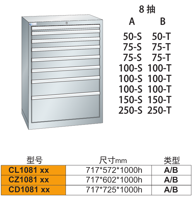 工具柜工具柜C-1081介紹:工具柜適用于工具、刀具、零部件在生產(chǎn)現(xiàn)場(chǎng)中的定置管理,8抽抽屜式設(shè)計(jì),使你的物品存取工作真正做到準(zhǔn)時(shí)、準(zhǔn)確、高效、低耗。