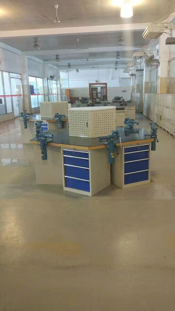 六角工作臺(tái)顧名思義其有六個(gè)角六個(gè)工位,是由六個(gè)工位以弧形方式圍著坐成一圈。其特點(diǎn)是節(jié)省空間適合以小組為單位培訓(xùn)及作業(yè),如此提高工作效率。 六角工作臺(tái)一般適合于學(xué)校精工實(shí)習(xí)教學(xué)方面和公司工廠團(tuán)體小組協(xié)作完成生產(chǎn)工作。 1,尺寸:每個(gè)工位邊長(zhǎng)為1200mm,落地高度為700MM臺(tái)面采用50mm厚的綠色高分子復(fù)合桌面或櫸木桌面,鐵板合成桌面; 2,臺(tái)子配置6個(gè)落地柜,每個(gè)落地可配抽抽斗,可調(diào)擱板。 3,柜體采用1.2mm厚優(yōu)質(zhì)冷軋板精工制作而成。 4,臺(tái)面上一般可配4寸或6寸或8寸大小的6個(gè)臺(tái)虎鉗。 5,臺(tái)面上可配電源島,或工具掛板,看板。