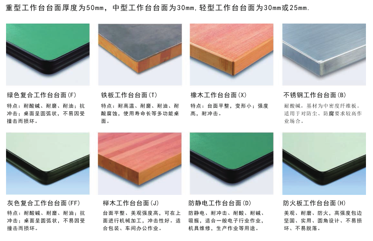 重型工作臺臺面厚度為50mm,中型工作臺臺面厚度為30mm,輕型工作臺臺面厚度為30mm或25mm,工作臺,各種臺面的特點(diǎn):1,綠色復(fù)合工作臺臺面,特點(diǎn):耐酸堿,耐磨,耐油,抗沖擊,桌面呈圓弧狀,不易因受撞擊而損壞。2,鐵板工作臺臺面,特點(diǎn):耐高溫,耐磨,耐油,耐酸腐蝕,使用壽命長等多功能桌面。3,橡木工作臺臺面,特點(diǎn):臺面平整,變形小,強(qiáng)度高,耐沖擊。4,不銹鋼工作臺臺面,特點(diǎn):耐酸堿,基材為中密度纖維板。適用于防塵,防腐要求較高作業(yè)場合。5,灰色復(fù)合工作臺臺面,特點(diǎn):耐酸堿,耐磨,耐油,抗沖擊,桌面呈圓弧狀,不易因受撞擊而損壞。6,櫸木工作臺臺面,特點(diǎn):臺面平整,變形小,美觀強(qiáng)度高,可在上面進(jìn)行機(jī)械加工,沖擊性好,適合包裝,車間辦公作業(yè)。7,防靜工作臺臺面,特點(diǎn):防靜電。耐酸堿,抗沖擊,吸振,適用于電子行業(yè)作業(yè),機(jī)具維修,生產(chǎn)作業(yè)等用途。8,防火板工作臺臺面,特點(diǎn):美觀,防火,耐磨,高強(qiáng)度包邊堅(jiān)固,實(shí)用,圓角設(shè)計(jì),不易損壞,不易脫落。*工具柜|工具車|工作臺|首選上海冠久021-69981259