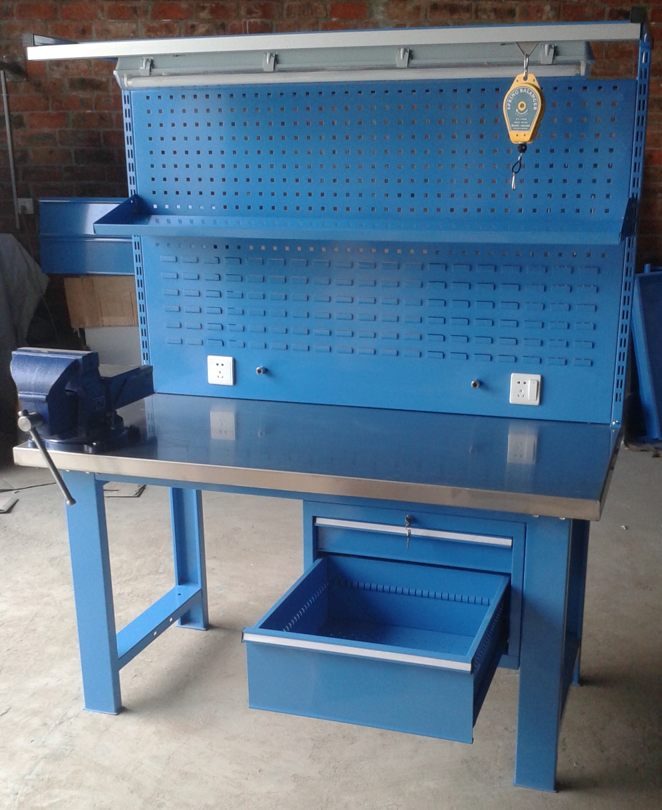 工作臺(tái),配置有各類(lèi)掛板,擱板或吊柜,完全匹配作業(yè)習(xí)慣和需求,與其說(shuō)是一個(gè)工作臺(tái),不如說(shuō)是一套完整的工作系統(tǒng)或是一個(gè)工作系統(tǒng)站。因?yàn)楣ぷ髋_(tái)滿足了作業(yè)平臺(tái),作業(yè)取料,作業(yè)檢驗(yàn)的整體需求,它是一種整體解決方案。只要伸手就能解決的問(wèn)題就是提高效率的動(dòng)作,簡(jiǎn)單的工作臺(tái),就是桌架和臺(tái)面組成,有時(shí)員工需要放些螺絲等小型物料,直接放到桌面上,除了會(huì)減少作業(yè)面積,還是影響整個(gè)車(chē)間的形象。這不符合6S的要求。所以,一套完整的工作臺(tái)是每個(gè)工位必備的器具。